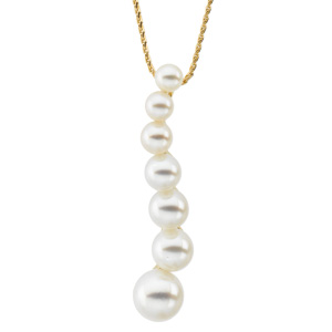 Freshwater Cultured Pearl Necklace. 18-inch sparkle singapore chain CH617 included. Available in 14K Yellow Gold or 14K White Gold. Set with 1ea 0.110 Ct -- 4.00 MM, Round Gemstone PEARL, 1ea 0.150 Ct -- 4.50 MM, Round Gemstone PEARL, 1ea 0.190 Ct -- 5.00 MM, Round Gemstone PEARL, 1ea 0.280 Ct -- 5.50 MM, Round Gemstone PEARL, 1ea 0.440 Ct -- 6.50 MM, Round Gemstone PEARL & 2ea 0.070 Ct -- 3.50 MM, Round Gemstone PEARL.