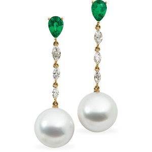 South Sea Cultured Pearl, Genuine Emerald & Diamond Earrings | 12 mm Baroque | 3/4 Carat TW. 18K Yellow Gold. Set with 2ea 04.00x02.00 MM Faceted, VS MARQUISE FACETED GHI GENUINE DIAMOND, 2ea 04.25x02.25 MM Faceted, VS MARQUISE FACETED GHI GENUINE DIAMOND, 2ea 05.00x02.50 MM Faceted, VS MARQUISE FACETED GHI GENUINE DIAMOND, 2ea 07.00x05.00 MM AA Faceted, Genuine Emerald - Pear Shape Faceted; AA Quality & 2ea 12.00 MM Fine Undrilled, Cultured Pearl South Sea - Baroque Undrilled Paspaley South Sea Pair; Fine Quality; White.