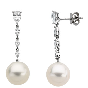 South Sea Cultured Pearl & Diamond Earrings | 11 mm Baroque | 1 1/3 Carat TW. 18K Palladium White. Set with 2ea 04.00x02.00 MM Faceted, VS MARQUISE FACETED GHI GENUINE DIAMOND, 2ea 04.25x02.25 MM Faceted, VS MARQUISE FACETED GHI GENUINE DIAMOND, 2ea 05.00x02.50 MM Faceted, VS MARQUISE FACETED GHI GENUINE DIAMOND, 2ea 06.00x04.00 MM Faceted, VS PEAR SHAPE FACETED GHI GENUINE DIAMOND & 2ea 11.00 MM Fine Undrilled, Cultured Pearl South Sea - Baroque Undrilled Paspaley South Sea Pair; Fine Quality; White.