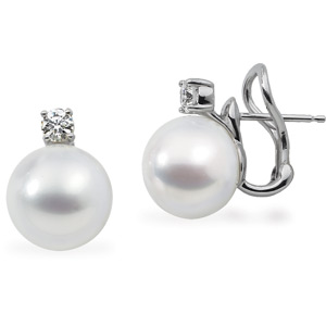 South Sea Cultured Pearl & Diamond Earrings | 12 mm Full Button | 1/2 Carat TW. 18K Palladium White. Set with 2ea 04.10 MM (03.90 - 04.20) Full Cut, VS ROUND FULL CUT G-H GENUINE DIAMOND & 2ea 12.00 MM Fine Undrilled, Cultured Pearl South Sea - Button-full Undrilled Paspaley South Sea Pair; Fine Quality; White.