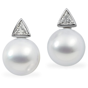 South Sea Cultured Pearl & Diamond Earrings | 12 mm Full Button | 1/2 Carat TW. 18K Palladium White. Set with 2ea 04.50 MM Faceted, VS TRIANGLE FACETED GHI GENUINE DIAMOND & 2ea 12.00 MM Fine Undrilled, Cultured Pearl South Sea - Button-full Undrilled Paspaley South Sea Pair; Fine Quality; White.