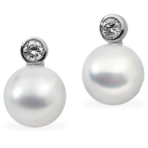 South Sea Cultured Pearl & Diamond Earrings | 12 mm Full Button | 1/2 Carat TW. 18K Palladium White. Set with 2ea 04.10 MM (03.90 - 04.20) Full Cut, VS ROUND FULL CUT G-H GENUINE DIAMOND & 2ea 12.00 MM Fine Undrilled, Cultured Pearl South Sea - Button-full Undrilled Paspaley South Sea Pair; Fine Quality; White.