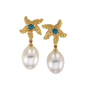 South Sea Cultured Pearl & Genuine Turquoise Earrings | 11 mm Fine Drop. 18K Yellow Gold. Set with 2ea 03.50 MM Standard Cab, Genuine Turquoise - Round Cab & 2ea 11.00 MM Fine Undrilled, Cultured Pearl South Sea - Drop Undrilled Paspaley South Sea Pair; Fine Quality; White.