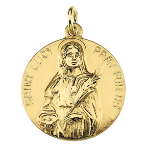 St. Lucy Medal | 18 mm. St. Lucy is the patron saint of eye trouble and writers. Available in 14K Yellow Gold.