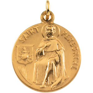 St. Peregrine Medal | 18 mm. St. Peregrine is the patron saint of cancer patients. Available in 14K Yellow Gold.